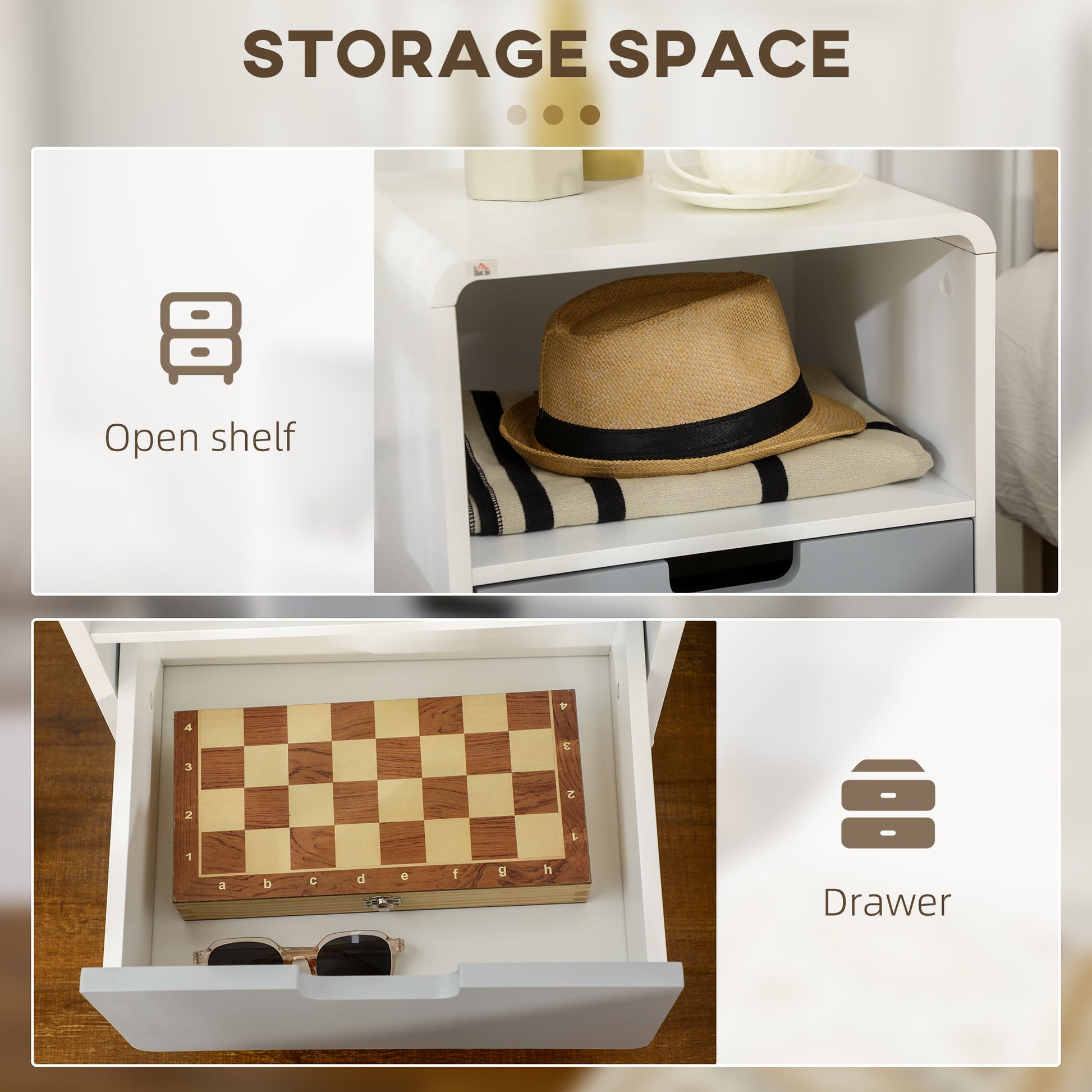 - Lots of storage: Features a small open shelf and a grey lower drawer and a sleek top surface. Ideal for plants, ornaments or reading lamp. The hollow drawer handle adds a unique touch.